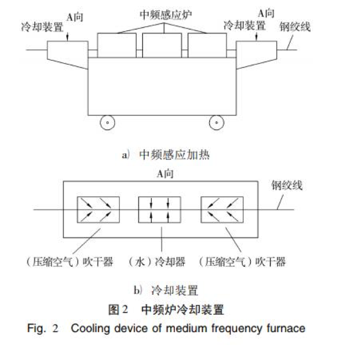 低松弛預(yù)應(yīng)力混凝土用鋼絞線廣泛應(yīng)用于高層 建筑、大跨度橋梁、核電站安全殼中[1]。由于預(yù)應(yīng) 力鋼材的應(yīng)力松弛,預(yù)應(yīng)力混凝土結(jié)構(gòu)中的應(yīng)力值 逐漸下降,使結(jié)構(gòu)達(dá)不到設(shè)計(jì)壽命而提前破壞[2]。 穩(wěn)定化處理是鋼絞線獲得低松弛性能較普遍的一種 生產(chǎn)工藝,即鋼絞線在承受 30% ~ 50% 抗拉強(qiáng)度的 張拉力下,進(jìn)行 350 ~ 400 ℃消除應(yīng)力回火。經(jīng)這種 方法處理的鋼絞線 70% 實(shí)際破斷力下連續(xù) 1 000 h 松弛值不大于 2. 5% 。 低松馳預(yù)應(yīng)力鋼絞線生產(chǎn)工藝流程: 放線→鋼 絞線捻制→張力下回火( 穩(wěn)定化處理) →冷卻→吹 干→收線。目前,穩(wěn)定化處理均采用中頻感應(yīng)加熱爐對鋼 絞線進(jìn)行回火[3]。鋼絞線穩(wěn)定化處理生產(chǎn)線使用 的中頻感應(yīng)加熱爐為移動式,加熱爐兩端帶有冷卻 與吹干裝置,可以提高鋼絞線的成材率。
