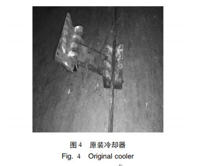 長期生產(chǎn)運(yùn)行中,發(fā)現(xiàn)中頻爐兩端原 裝的冷卻裝置冷卻效果不佳,既影響產(chǎn)品質(zhì)量,又易 造成鋼絞線整根斷裂,存在極大的安全隱患,對人身 和設(shè)備造成傷害。 正常生產(chǎn)的鋼絞線經(jīng)冷卻后溫度不高于 60 ℃[4],而經(jīng)中頻爐自帶的冷卻裝置一次自動冷卻后 的鋼絞線溫度仍然過高,約 150 ℃ 左右[5],如果此 時生產(chǎn)線啟動,將對此部分鋼絞線進(jìn)行二次加熱,由 于溫度疊加,造成溫度急劇上升,使鋼絞線加熱溫度 過高,在 30% ~ 50% 抗拉強(qiáng)度的張拉力作用下易造 成鋼絞線整根斷裂。為避免此現(xiàn)象發(fā)生,必須由人 工操作,將中頻爐在位置1 與位置2 之間行走2 至3 次,才能將鋼絞線的溫度降至 60 ℃以下。這樣操作 既浪費(fèi)時間也降低生產(chǎn)效率。而且由于需要反復(fù)多 次冷卻,中頻爐冷卻器、吹干器等相關(guān)部件使用頻次 增加,維護(hù)成本提高。 經(jīng)反復(fù)查找,發(fā)現(xiàn)中頻爐原裝的冷卻裝置( 圖 3) 冷卻效果差與其冷卻器( 圖 4) 有關(guān),原設(shè)計(jì)冷卻器與吹干器為銅制合頁式交錯咬齒形結(jié)構(gòu),該設(shè)計(jì) 存在以下問題: ( 1) 采用噴淋式冷卻,冷卻面積小。 ( 2) 冷卻器短,長度只有 135 mm。 ( 3) 冷卻水流量小,只有 16 個直徑為 1 mm 的 出水口。 ( 4) 冷卻器數(shù)量少,受設(shè)備總體布局的約束,中 頻爐兩端分別有一個冷卻器。 ( 5) 工作環(huán)境高溫、高油煙,冷卻器出水孔易堵 塞,不能正常工作。 ( 6) 生產(chǎn)線停止運(yùn)行時,中頻爐由位置 2 向位 置 1 移動過程中,由于鋼絞線沒有張力,受重力作用 鋼絞線自然下垂造成冷卻器磨損。由于冷卻器結(jié)構(gòu) 復(fù)雜難加工,因此制造成本高。