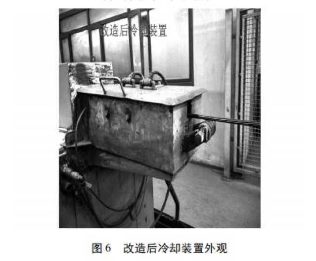 針對原中頻爐冷卻裝置存在的缺陷,經(jīng)過研究 并結(jié)合多年的設(shè)備、生產(chǎn)及工藝方面的相關(guān)經(jīng)驗(yàn),設(shè) 計(jì)出全新的 V 型直冷式可控大流量冷卻裝置。改 造后冷卻裝置內(nèi)部結(jié)構(gòu)如圖 5 所示,冷卻裝置外觀 如圖 6 所示。 改造后的冷卻裝置特點(diǎn): ( 1) 新裝置采用加長 V 型水槽儲水冷卻,水槽將原來冷卻水管道直徑由 10 mm 增加到 16 mm,冷 卻水的供給量增大了 2. 5 倍。因?yàn)?V 型水槽容積 小能使冷卻水充分快速流動而帶走大量熱量,同時 由于儲水式冷卻能使鋼絞線始終浸泡在冷卻水中, 增大了冷卻的面積,只需一次冷卻即可將鋼絞線冷 卻至60 ℃以下,保證了冷卻的效果。 ( 2) 在冷卻裝置中加裝了導(dǎo)線輥,當(dāng)生產(chǎn)線停 止運(yùn)行時,中頻爐由位置 2 向位置 1 移動過程中,導(dǎo) 線輥與導(dǎo)線輪對下垂的鋼絞線起到支撐,避免鋼絞 線懸空,使鋼絞線不與噴氣吹干部分及 V 型冷卻水 槽接觸,不會對冷卻水槽產(chǎn)生磨損。 ( 3) 新的冷卻裝置與吹干裝置不會堵塞,完全 能在高溫、高油煙環(huán)境下正常工作,無需清理新的冷卻裝置與吹干裝置使用效果良好,適合所有規(guī)格鋼絞線的生產(chǎn)。改造成本低,使用壽命長。 既避免了鋼絞線整根斷裂,又消除了安全隱患,實(shí)現(xiàn) 了無人化操作,提高了鋼絞線的成材率和勞動生 產(chǎn)率。