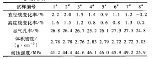 將所有試樣分別在1000、1200、1350和1600cI=熱處理3h后,觀察其燒結(jié)情況,同時將經(jīng)l350oC3h燒后的試樣4A一_4F再經(jīng)1600oC3h熱處理。對1600℃3h燒后的各試樣進(jìn)行直徑線變化率和高度線變化率(GB/T3997.1一l998)、體積密度(GB/T2997-2000)以及耐壓強(qiáng)度(GB/T5072-2008)檢測,同時并對現(xiàn)場使用后的干式搗打料殘襯進(jìn)行顯微結(jié)構(gòu)觀察。
