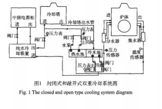 中頻爐的冷卻方式多種多樣,并且隨著中頻爐的發(fā)展而發(fā)展。發(fā)展初期,中小功率的中頻爐一般采用水池+水泵的開放式冷卻系統(tǒng)。由于中頻電源內(nèi)的元器件和補償電容器的冷卻水管道比較細,為了防止結(jié)垢堵塞管道,出現(xiàn)了使用軟化水或純凈水的閉路循環(huán)冷卻方式,現(xiàn)在中頻電源和補償電容器多采用封閉冷卻塔方式冷卻l3l。中頻爐爐體的感應(yīng)線圈工作時會產(chǎn)生大量的熱量,但因感應(yīng)圈內(nèi)徑較粗不易發(fā)生堵塞,爐體冷卻水溫度可以略高,這樣反而能夠提高電爐的熱效率,同時減小冷卻裝置的體積,可以采用帶冷卻塔敞開式循環(huán)冷卻系統(tǒng),也可以采用封閉式冷卻塔。由于封閉式和敞開式雙重冷卻系統(tǒng)運行可靠、所需費用較低因此應(yīng)用的也較多。