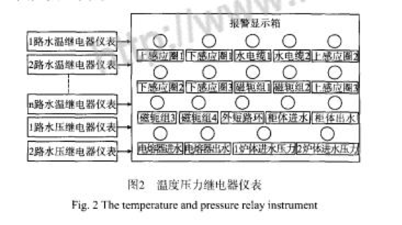 中頻電源的主控板上設(shè)有水溫、水壓超限報警指示燈,在冷卻水系統(tǒng)通好水后首先調(diào)整水壓繼電器,使主控板上水壓指示燈指示正常。另外在電源柜的進水管和m水管及電容器出水管安裝水溫繼電器儀表,爐體出水管各路都要安裝水溫繼電器儀表,爐體進水安裝水壓繼電器。所有水溫、水壓繼電器信號連接到報警顯示箱,當(dāng)某一路超限或有故障時,報警箱中報警燈亮,并可發(fā)報警聲音提示,即可知道哪一條水路有問題,去現(xiàn)場相應(yīng)位置查找故障的原因。原琿框圖如圖2所示。
