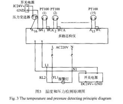 溫度、壓力巡檢儀包括開關(guān)電源、多路巡檢儀、壓力變送器、溫度傳感器、報警燈等組成。可以根據(jù)用戶的需要選擇相應(yīng)的8—40路巡檢儀,按照圖3進行硬件設(shè)計,根據(jù)巡檢儀操作面板進行相應(yīng)的設(shè)定,可以設(shè)定多少路數(shù)、下限報警值、能夠顯示任意一路的設(shè)定溫度和實際溫度值。當(dāng)某一路發(fā)生報警時巡檢儀面板中相應(yīng)的指示燈亮,同時繼電器輸出報警燈閃光也可以進行遠傳報警信號,能夠?qū)崿F(xiàn)本地控制和遠傳功能。