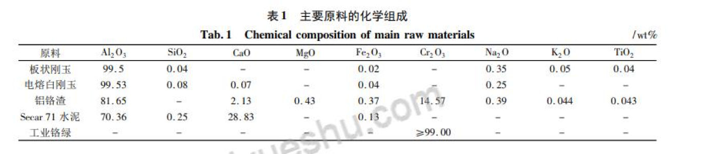 實(shí)驗(yàn)用主要原料有板狀剛玉( 5 ~ 3 mm、3 ~ 1 mm、1 ~ 0 mm 和≤0. 088 mm) 、電熔白剛玉( 5 ~ 3 mm、3 ~ 1 mm、1 ~ 0 mm 和≤ 0. 088 mm) 、鋁鉻渣( 5 ~ 3 mm 、3 ~ 1 mm、1 ~ 0 mm 和≤ 0. 088 mm) 、純鋁酸鈣水泥( Secar 71) 、磷酸溶液( 濃度 60% ) 和工業(yè)鉻綠。板狀剛玉體積密度 5. 53 ~ 5. 57 g·cm - 3,吸水率為 1. 0% ~ 1. 09% ,顯氣孔率約 4. 1% ~ 4. 8% ; 電熔白剛玉體積密度 3. 54 ~ 3. 70 g·cm - 3,吸水率為 2. 43% ~ 2. 58% , 顆粒料的顯氣孔率約 6. 1% ~ 7. 4% ; 鋁鉻渣顆粒體積密度為3. 29 ~ 3. 37 g·cm - 3,吸水率為 4. 2% ~ 4. 6% , 顯氣孔率 10. 3% ~ 12. 1% 。原料的化學(xué)組成見(jiàn)表 1。
