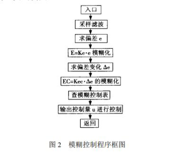 中頻爐溫度的模糊控制器是模糊控制系統(tǒng)的核心 ,它是一 種利用專家知識和操作者經(jīng)驗設(shè)計的專家控制系 統(tǒng) ,設(shè)計時不用數(shù)學(xué)解析模型來描述受控系統(tǒng)的 特性。在本溫度控制系統(tǒng)設(shè)計中 ,采用二維模糊 控制器 ,即以偏差 e 和偏差變化率Δe 作為模糊控制器的輸入變量 ,把加熱操作量作為輸出變量。 在模糊控制過程中 ,同時把偏差和偏差的變化率 作為模糊輸入量 ,這種方法不僅能保證系統(tǒng)控制 的穩(wěn)定性 ,而且還可減少超調(diào)量和振蕩現(xiàn)象。根 據(jù)受控系統(tǒng)的實際情況 ,確定輸入變量的測量范 圍和輸出變量的控制作用范圍 ,以確定每個變量 的論域 , Ke、Kec 和 Ku 分別為輸入和輸出變量的 量化因子和比例因子。先經(jīng)限幅處理 ,再經(jīng)量化 處理就得到了 E 和 EC。根據(jù)當前已求得的 E 和 EC ,直接查詢模糊控制表就獲得控制量的變化值 ΔU ,將該變化值ΔU 乘以比例因子 Ku ,即可得到 當前的實際控制量增量Δu。再將該增量和前一采 樣時刻的實際控制量相加 ,就得到目前應(yīng)實施的 控制動作 ,即 uk = uk - 1 + Ku ·ΔU ,其模糊控制 程序框圖如圖 2 所示。
