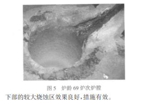 本次試驗(yàn)爐齡 79 爐次達(dá)到了預(yù)期壽命,說明試 驗(yàn)方案合理,試驗(yàn)成功。從試驗(yàn)過程中觀察到:中期 燒結(jié)有效地減緩了爐襯的損耗速度,措施有效;兩次 中修均達(dá)到了預(yù)期目的,使用短坩鍋中修應(yīng)對爐膛下部的較大燒蝕區(qū)效果良好,措施有效。
