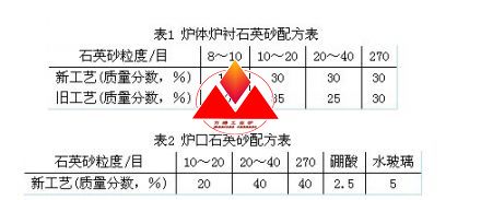 石英砂的粒度配比及搗固方法影響爐襯的使用壽命,其主要影響爐襯的耐蝕性能和抗高溫沖擊性能。經(jīng)試驗(yàn),爐襯的抗侵蝕能力與其基體密度成正比,密度越大,基體組織越密,爐襯的抗侵蝕能力越強(qiáng)。在結(jié)合客戶(hù)實(shí)際生產(chǎn)的基礎(chǔ)上,采用表1所示的石英砂配方。爐口石英砂采用表2所示的改進(jìn)配方。